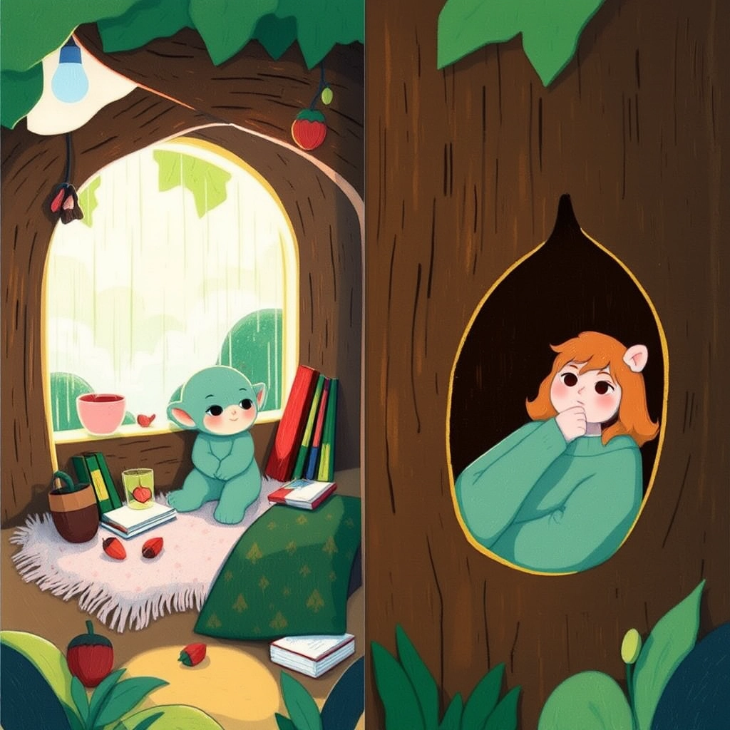But the rain didn’t stop for days, and Squeezy and Ruby stayed in their homes, feeling lonely and missing each other terribly.