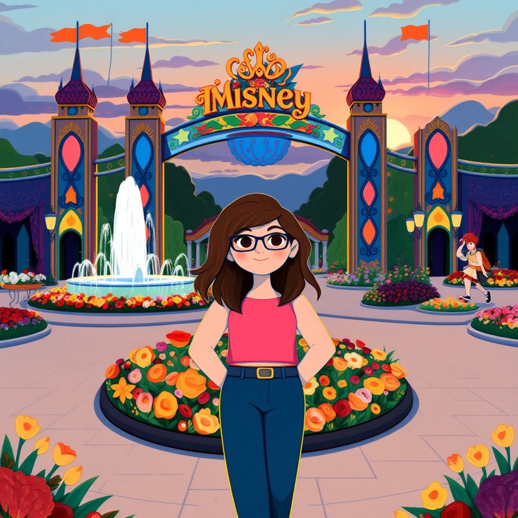 [Bethany](33M4S3CB) adjusted her blue glasses and stood at the gates of the grand Disney theme park. The air was electric with magic, and the distant sound of cheerful music seemed to beckon her in for an adventure like no other.