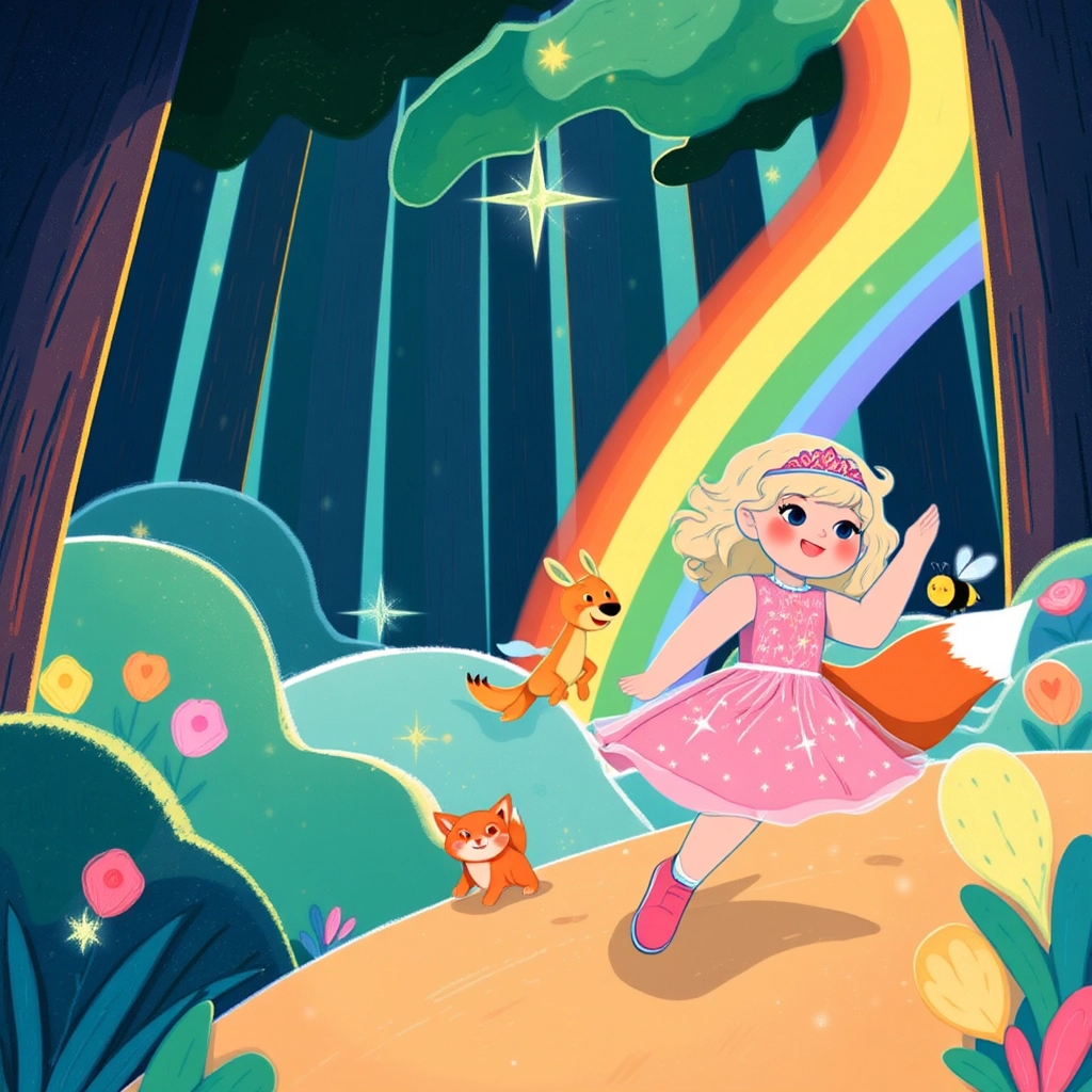 'I'm following the rainbow!' [Betsy](57XJDBJG) said. 'Come with me!' The fox grinned and joined her. Together, they skipped along the sparkling path.