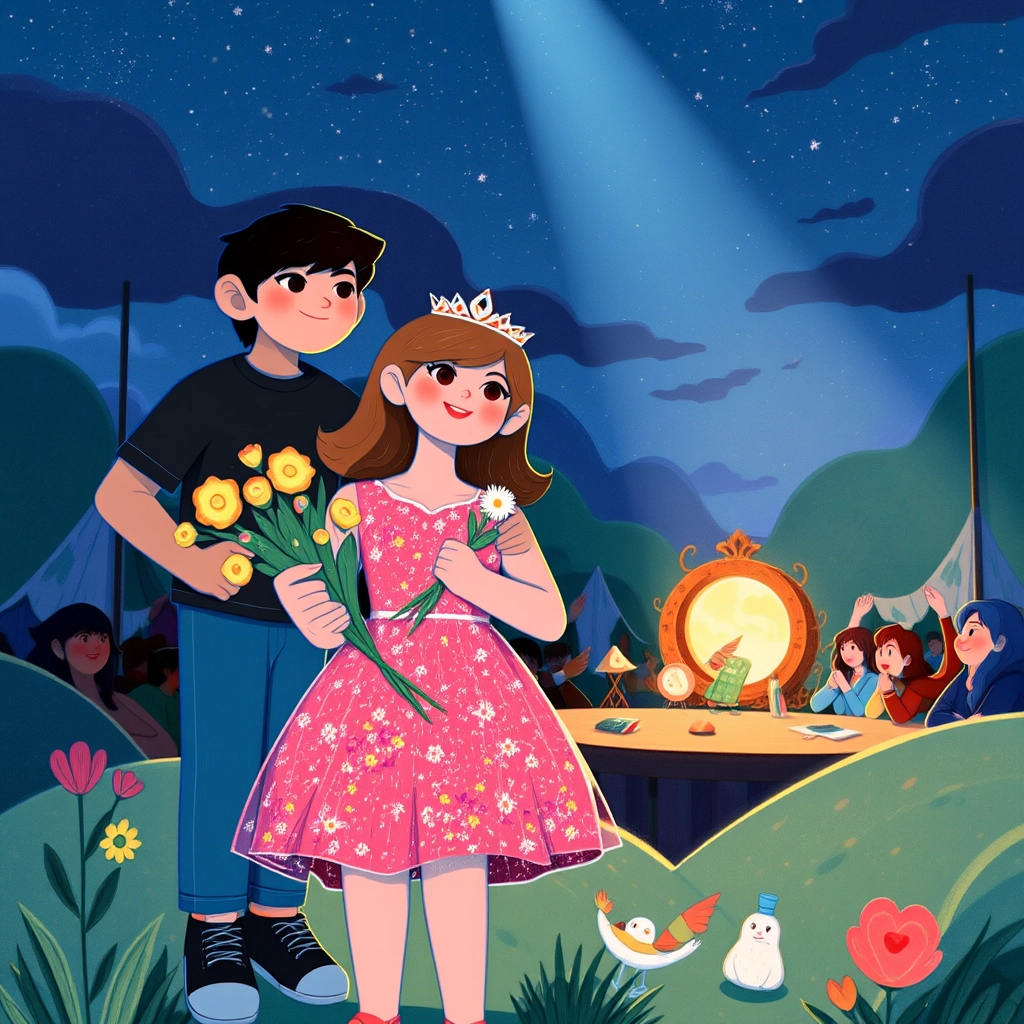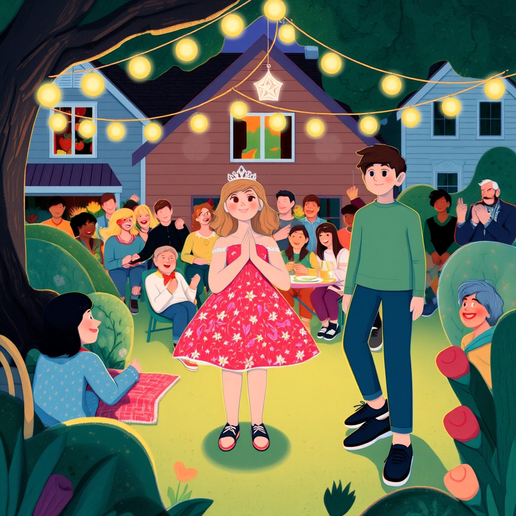 On the night of her big backyard show, her neighbors and friends came to watch. [Bianca](M9Q6BWXL) felt nervous, but [Bryan](KTWVG6YH) whispered, 'You can do this, superstar!'