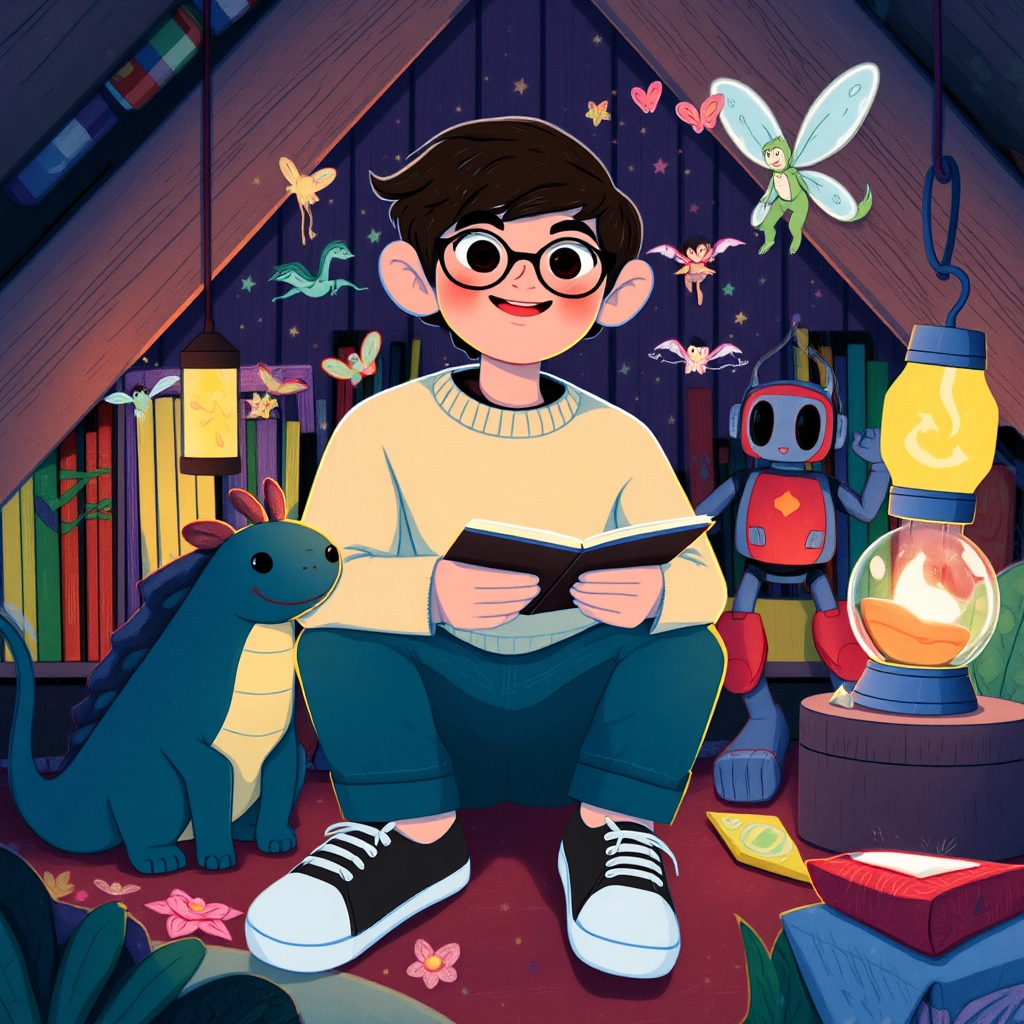 [Bima](SNKQG2JS) was a quiet boy who loved to draw. One rainy afternoon, he wandered up to the attic in search of inspiration. There, hidden among old boxes and forgotten treasures, he discovered a dusty lantern that seemed to shimmer faintly.