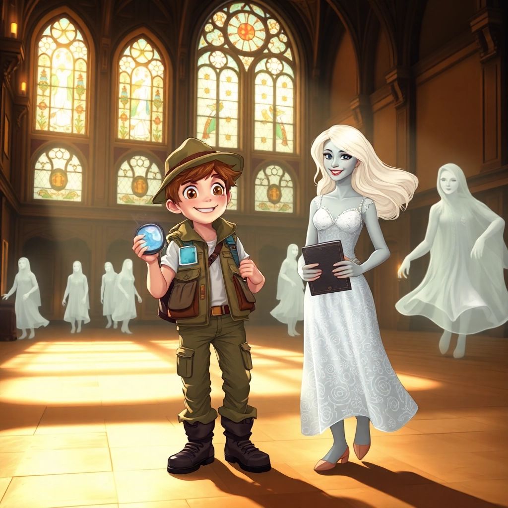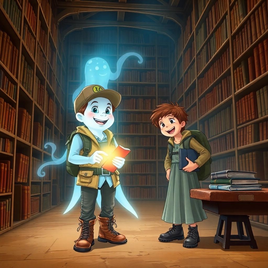 Following [Lady Eleanor](FD4K9TBN)'s clue about the hidden library, [Blas](BS7MWMKK) discovered a massive room with shelves stacked to the ceiling. As he searched, rumbling and echoes filled the air. A mischievous ghost, a young boy named [Percy](X5NM52NS), floated out, laughing as he pointed to an ancient book.