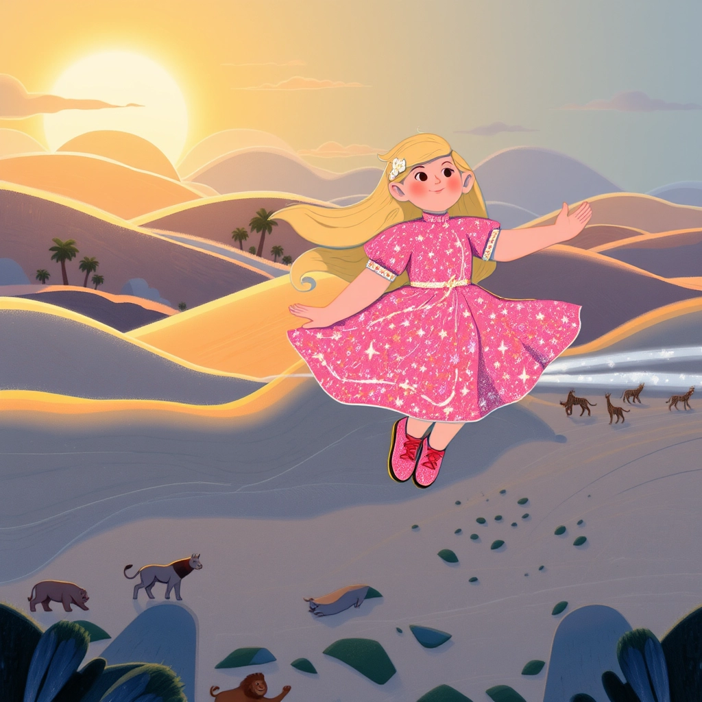 One day, [Bobby](XSK5F75W) decided to visit Africa! As they flew over the golden sands of the desert, the warmth of the sun kissed her cheeks, and she smiled with excitement. 'Let’s find some animals, Glitter!' [Bobby](XSK5F75W) cheered.