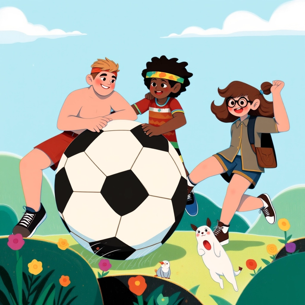 Finally, they reached a colorful field filled with every kind of sports ball. At the center was the biggest soccer ball they had ever seen, almost as big as a house.