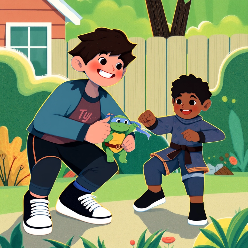 Then it was time for [Deon](MVLKWK2P)'s favorite game: pretend Ninja Turtles! He handed [Ty](R7BJZBM4) another action figure. 'Let's be heroes together!' [Deon](MVLKWK2P) said.