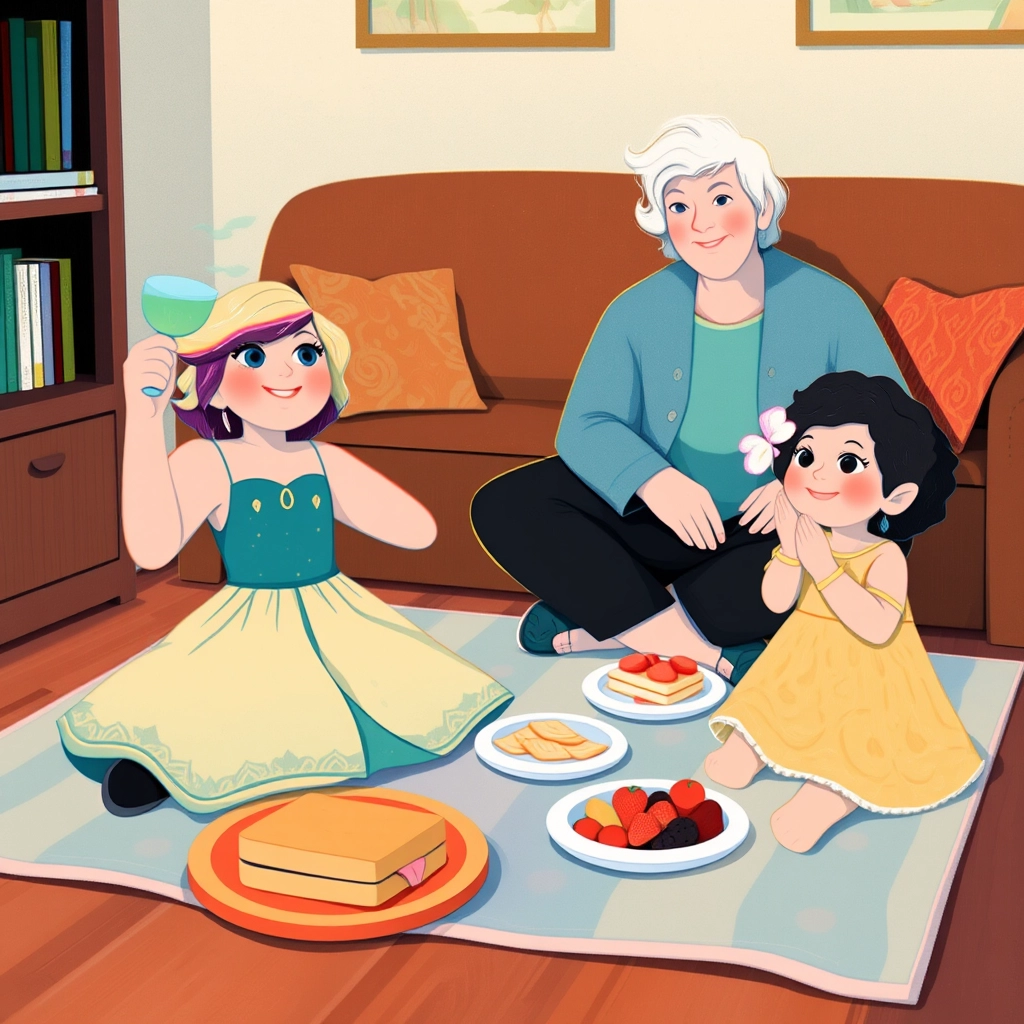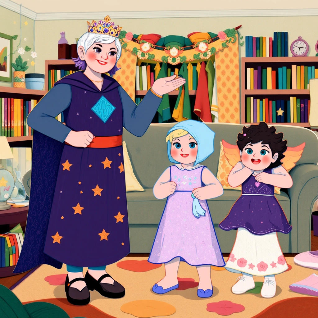 Next, they played dress-up! [Grandma](DPNGTKZ3) wore a shiny cape and a crown. [Sayge](TFQRP3MQ) picked out her favorite purple princess dress with stars, and [Sophia](XFCCZ3GY) had a giggly fit when [Grandma](DPNGTKZ3) tried to put a tiny hat on her.