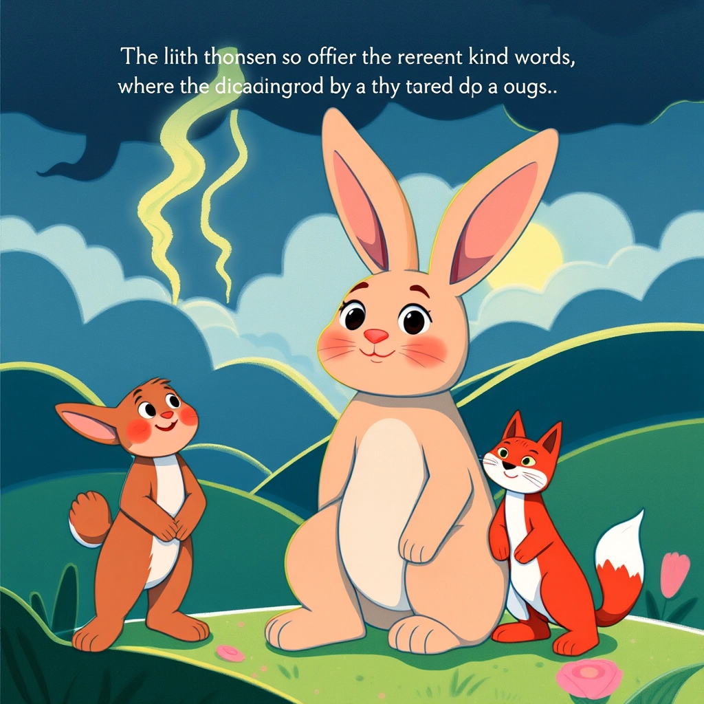 When the thunder rumbled, [Benny](N62YD3T6)’s ears perked up in alarm. [Felix](TVSZYLTJ) said, 'Sometimes, saying kind words to yourself helps. Try saying: I’m brave, I’m safe, and [Felix](TVSZYLTJ) is here with me.' [Benny](N62YD3T6) repeated the words, his voice growing steadier each time.