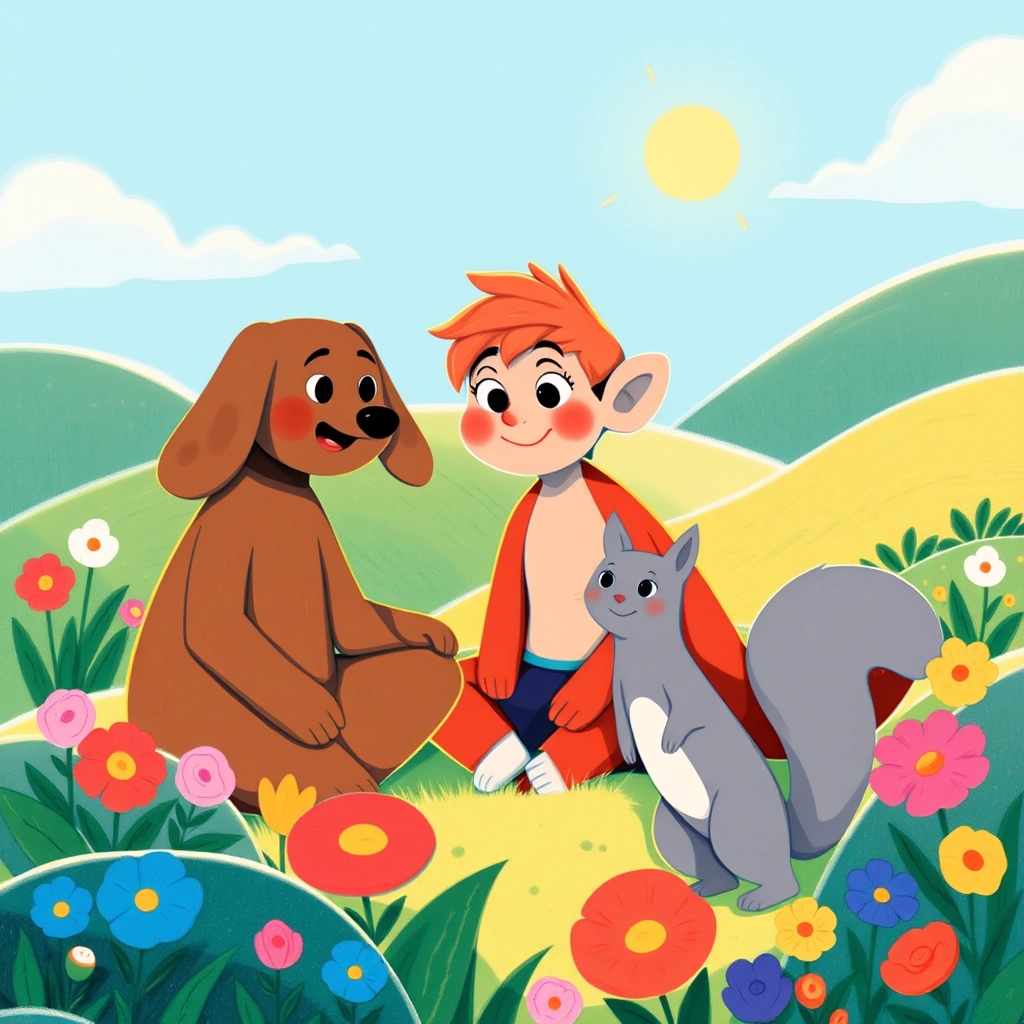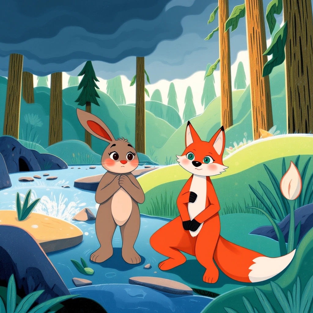 One breezy afternoon while playing by the brook, dark clouds rolled in. [Benny](N62YD3T6)’s heart started racing as he worried about the storm. 'What if it’s too loud?' he asked, his paws trembling slightly. [Felix](TVSZYLTJ) noticed and knelt beside him with a gentle smile.