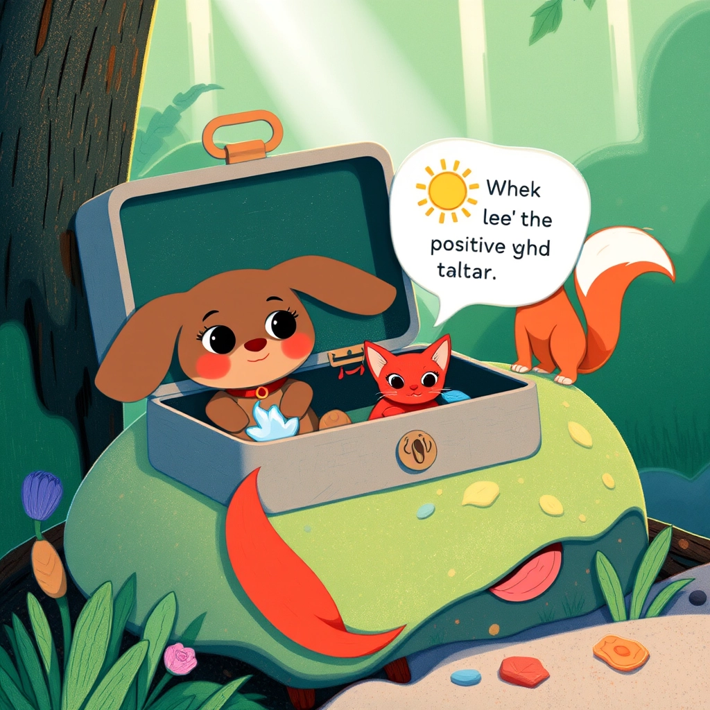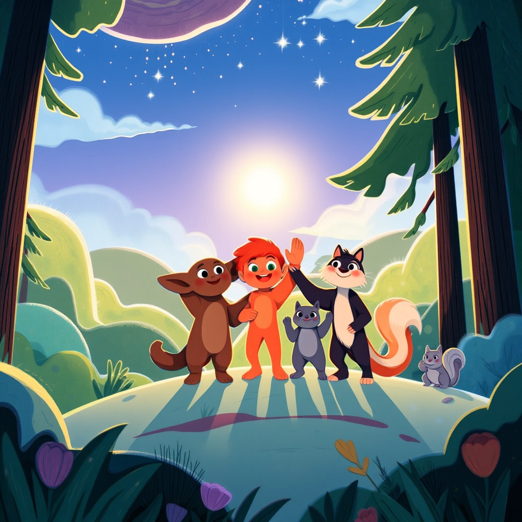 [Benny](N62YD3T6) said, 'We all have storms inside sometimes, but we can work through them.' [Mia](7MJQZDWT) smiled, trying her first breathing exercise with [Benny](N62YD3T6) and [Felix](TVSZYLTJ) by her side. The three friends laughed and played together as the forest filled with sunshine.