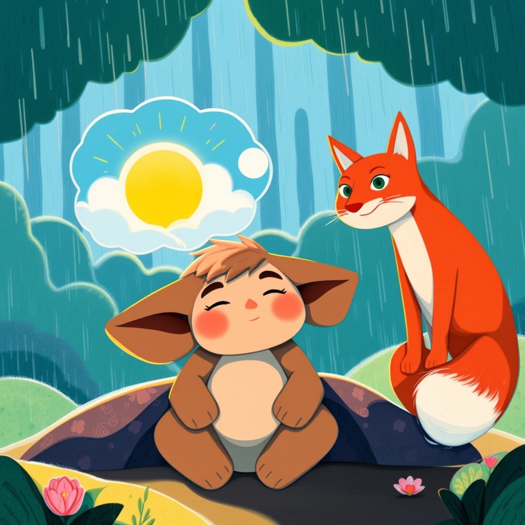 As the rain started falling softly, [Benny](N62YD3T6) still had a lingering worry. [Felix](TVSZYLTJ) suggested, 'Let’s imagine your worry as a little raincloud. Can you think of something sunny to replace it?' [Benny](N62YD3T6) closed his eyes and imagined warm sunshine, picnicking with [Felix](TVSZYLTJ). Slowly, the raincloud in his thoughts floated away.