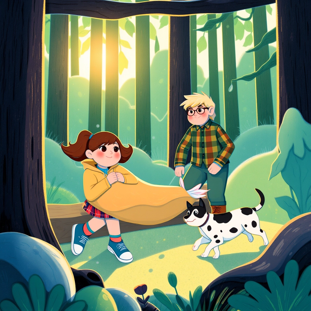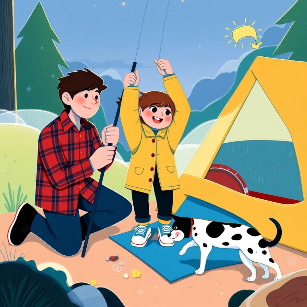 "Let’s set up the tent first," said [Jake](7HQSMMTW). [Mia](XHV9JZ7J) held the tent poles while [Max](HTQS4BN2) sniffed curiously at the fabric.
