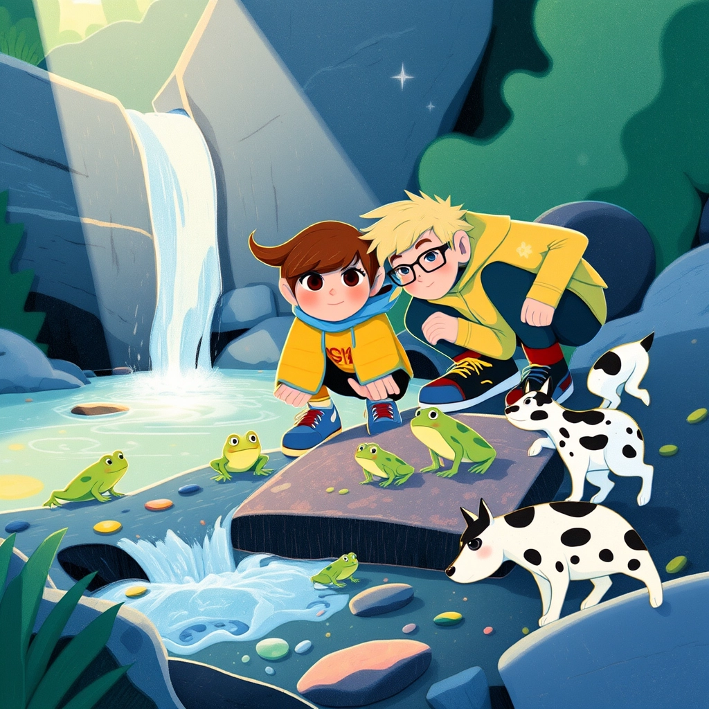 [Mia](XHV9JZ7J) spotted tiny frogs hopping near the water, and she squatted to watch. "Look, [Jake](7HQSMMTW)! Frogs!" she shouted.