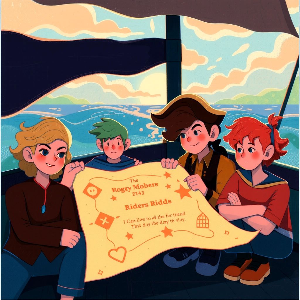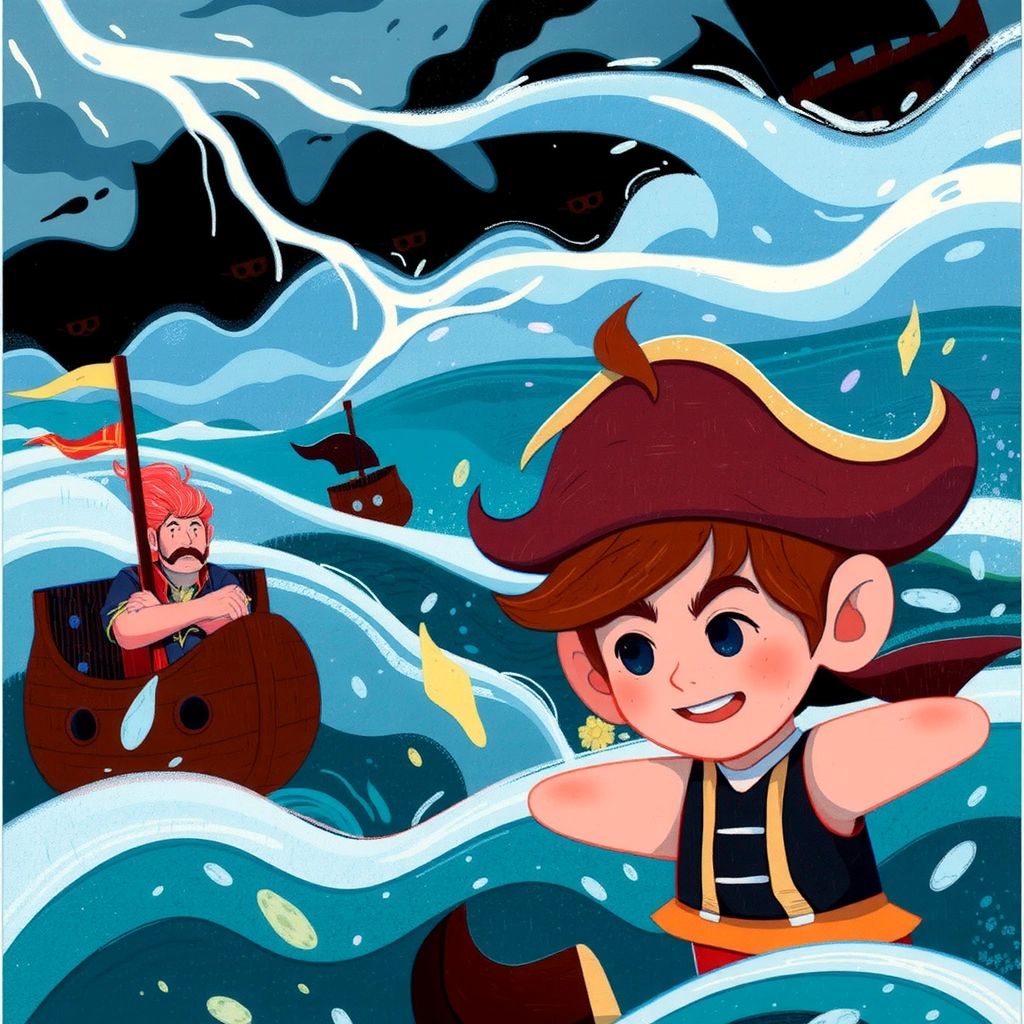 Guided by the map's riddle, they navigated through turbulent waters and serene seas. Suddenly, dark clouds gathered, and enemy pirate ships appeared on the horizon, seeking to claim the treasure for themselves!