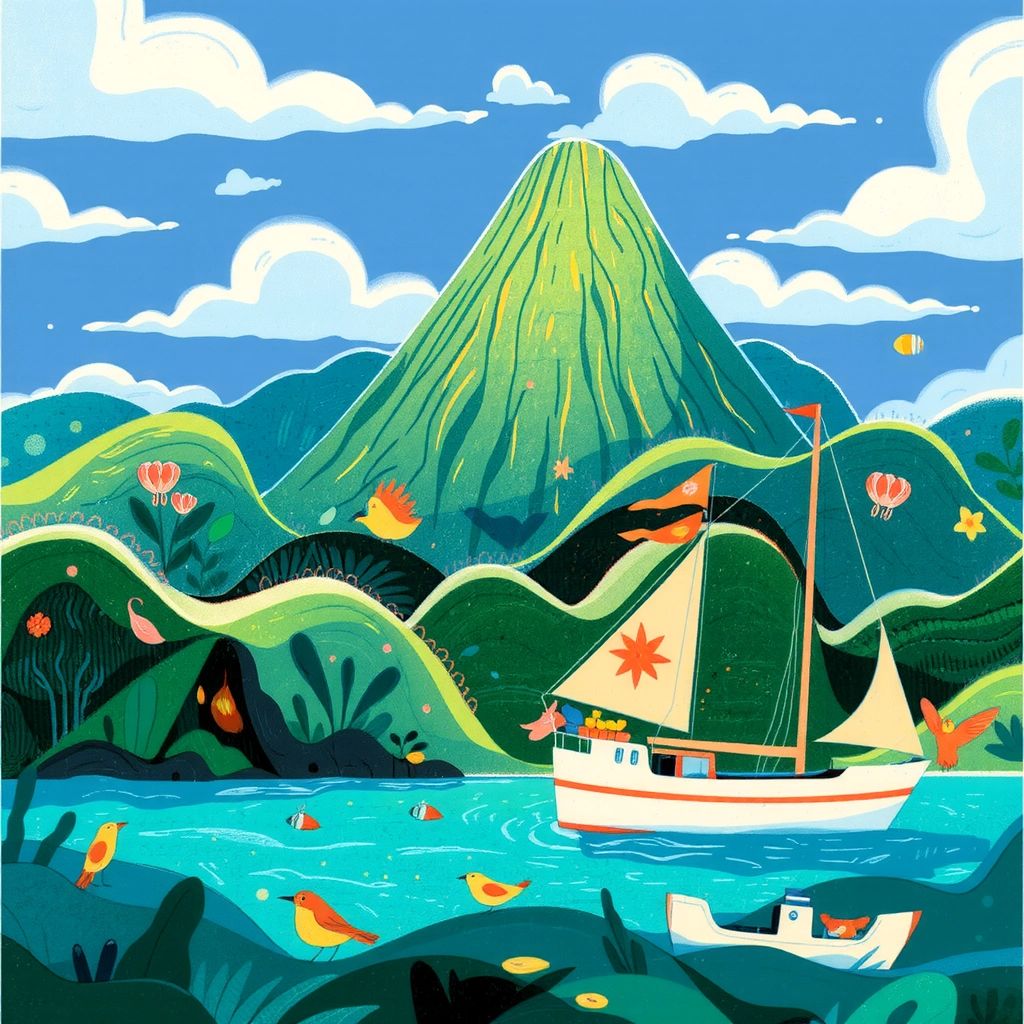 With the enemy pirates defeated, the journey continued until they finally reached the enchanted island — a paradise of lush greenery and towering mountains. The sun shone brightly, as if welcoming the brave adventurers.