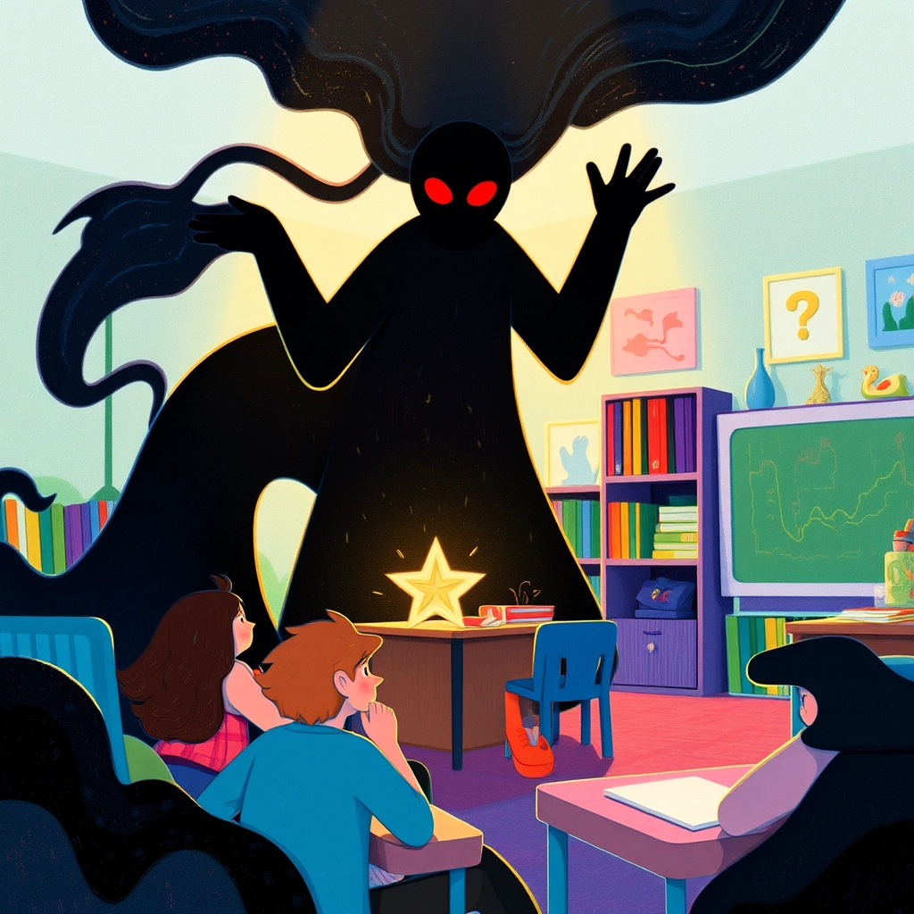 Before anyone could move, a villain named [Shadow](J3DQ2LSS), covered in dark smoke, emerged from the closet! 'No one can stop me!' [Shadow](J3DQ2LSS) bellowed, causing everyone to hide under their desks.