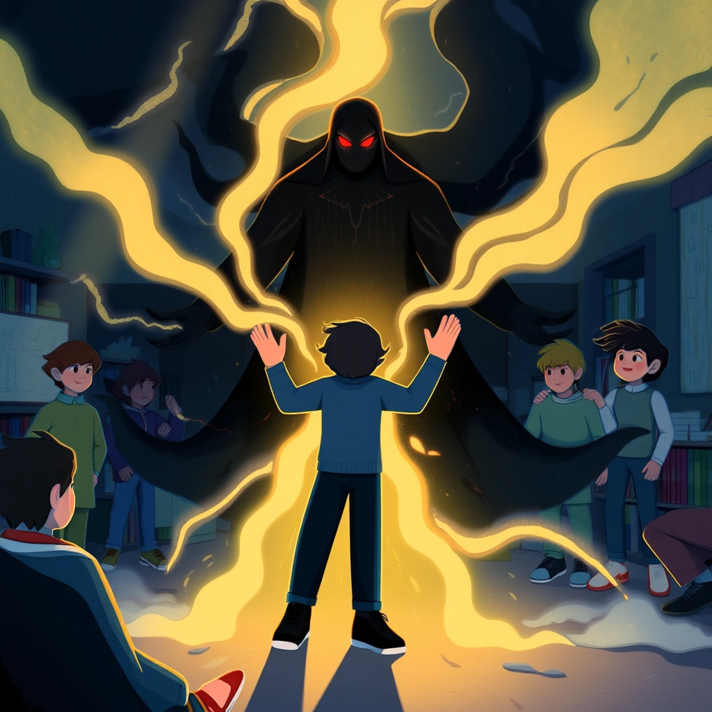 [Mrs. Smith](DQFZDCJT) tried to protect the class but tripped on her desk. [Shadow](J3DQ2LSS) was laughing wickedly when Carter stood up. 'Hey, stop it!' Carter shouted, surprising everyone with his courage.