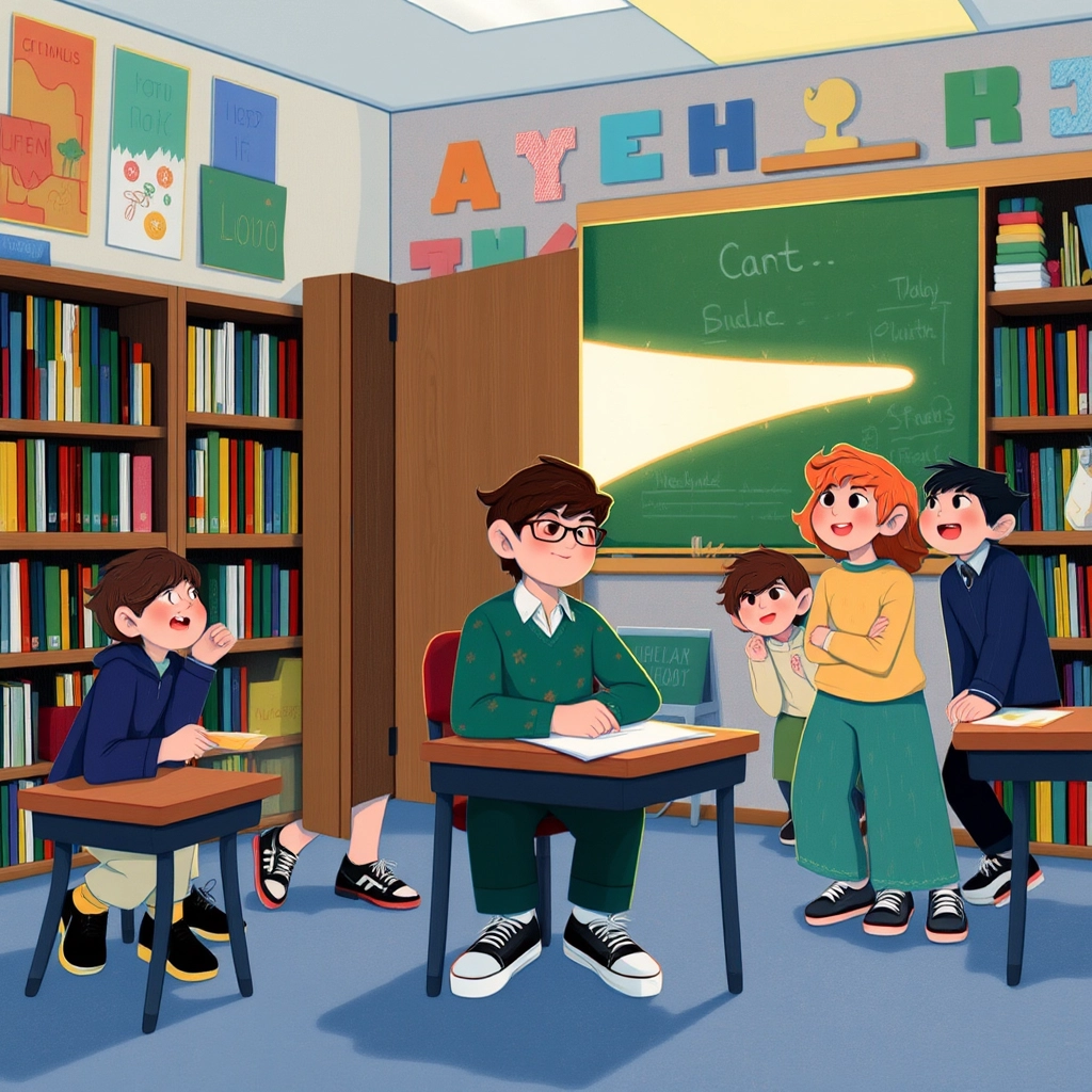 At school, Carter felt a little shy, especially in [Mrs. Smith](DQFZDCJT)'s classroom. Suddenly, a loud bang came from the classroom closet. Everyone froze. 'Help!' a voice cried out.