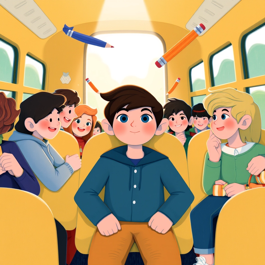 As the school bus drove him to school, Carter noticed something special. When he got nervous, pencils on the bus floated in the air! 'Whoa!' Carter gasped, staring at the spinning pencils.