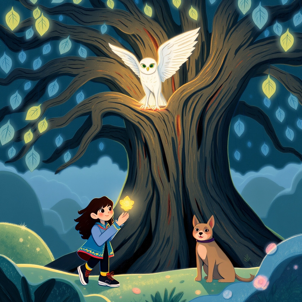The owl led [Cassia](YJYPBLRY) to a sparkling tree covered in golden fruit. 'To restore kindness to our world, use your heart to choose the truest golden fruit,' said the owl.