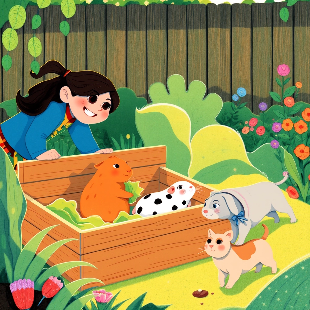 After breakfast, [Cassia](YJYPBLRY) decided to spend time with [Inti](GMFCZJY4) and her guinea pigs in the garden. The guinea pigs squeaked happily as she carefully placed them in their playpen. [Inti](GMFCZJY4) excitedly barked while jumping around in circles.