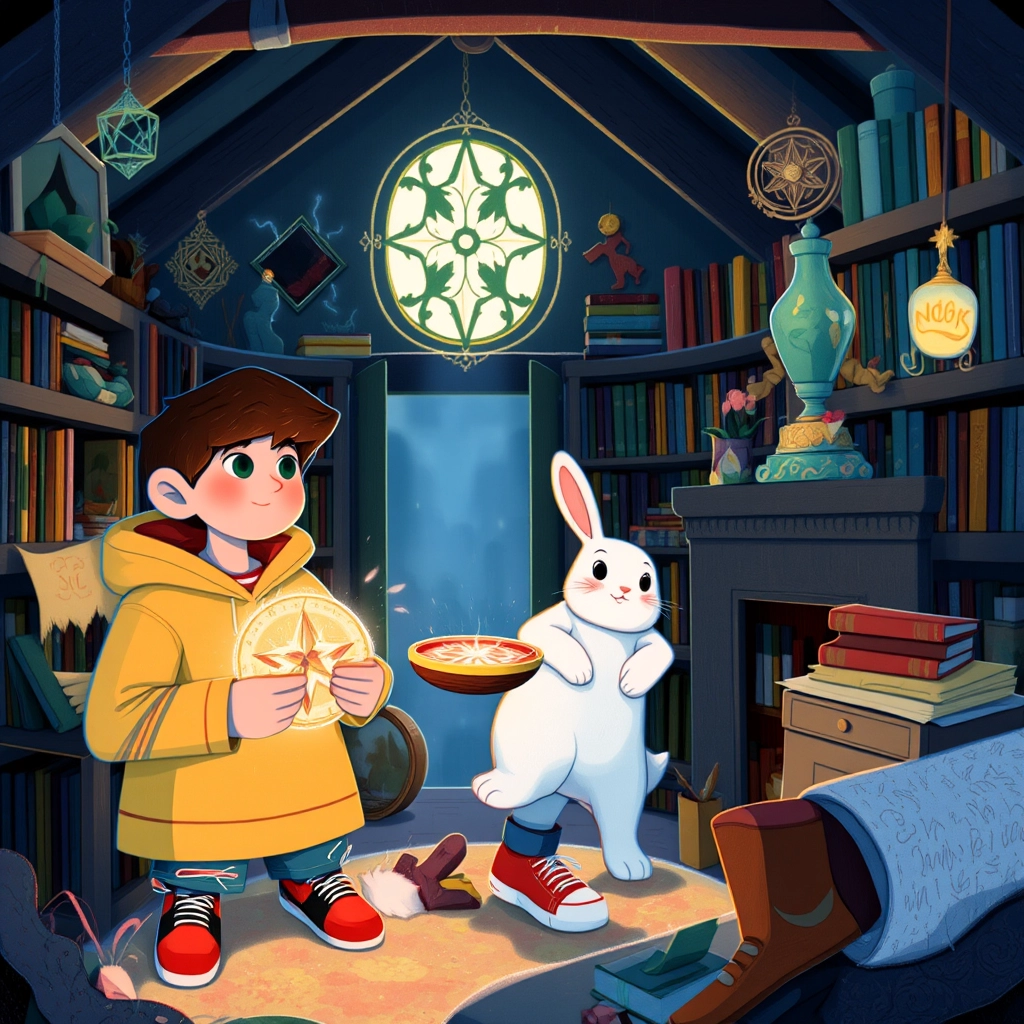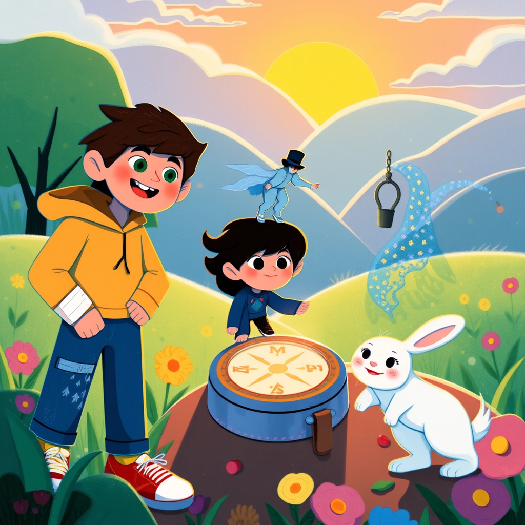 One day, while rummaging through the attic, they found an old magical compass. The compass started to glow, and a magical rabbit named [Theo](HTN6N6GL) hopped into view.
