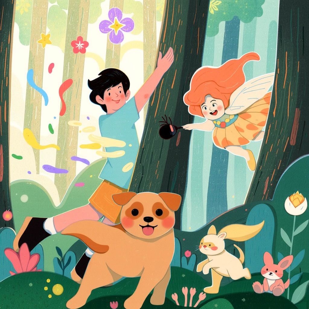 Together, they explored the Whispering Meadow, where butterflies danced and spoke in riddles. One butterfly told them the puppy had gone towards the Crystal Lake.