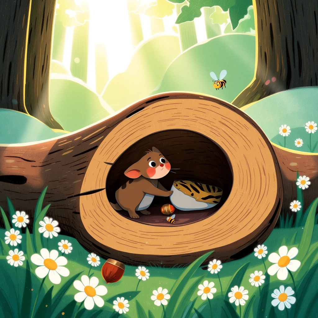 [Chester](XT5V47F5) then stumbled upon a hollow log. It looked like a cozy tunnel! But when he tried it, he heard a buzzing sound. Bees were already living there! [Chester](XT5V47F5) quickly scurried away before they noticed him.