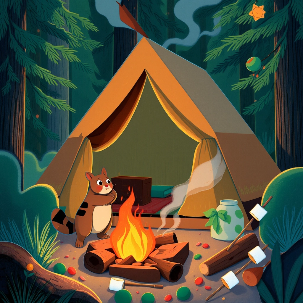 As [Chester](XT5V47F5) wandered further, he spotted a colorful tent left by campers. 'How fun!' he thought. But when the wind blew, it flapped loudly. [Chester](XT5V47F5)'s ears twitched. 'Too noisy for me!' he decided.