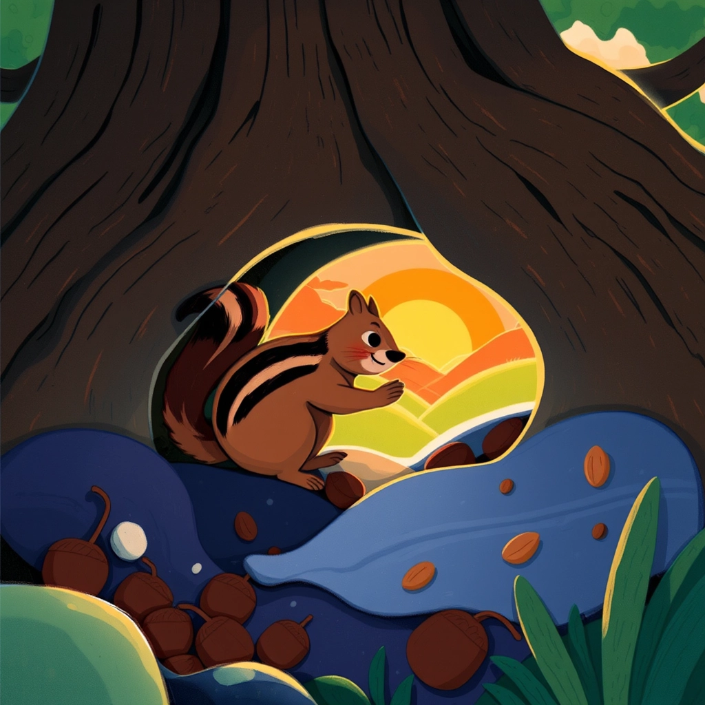 As the sun started setting, [Chester](XT5V47F5) hurried back to his own den. When he climbed inside, it felt like a warm hug. His little collection of acorns and the familiar scent of earth reminded him how special it was.
