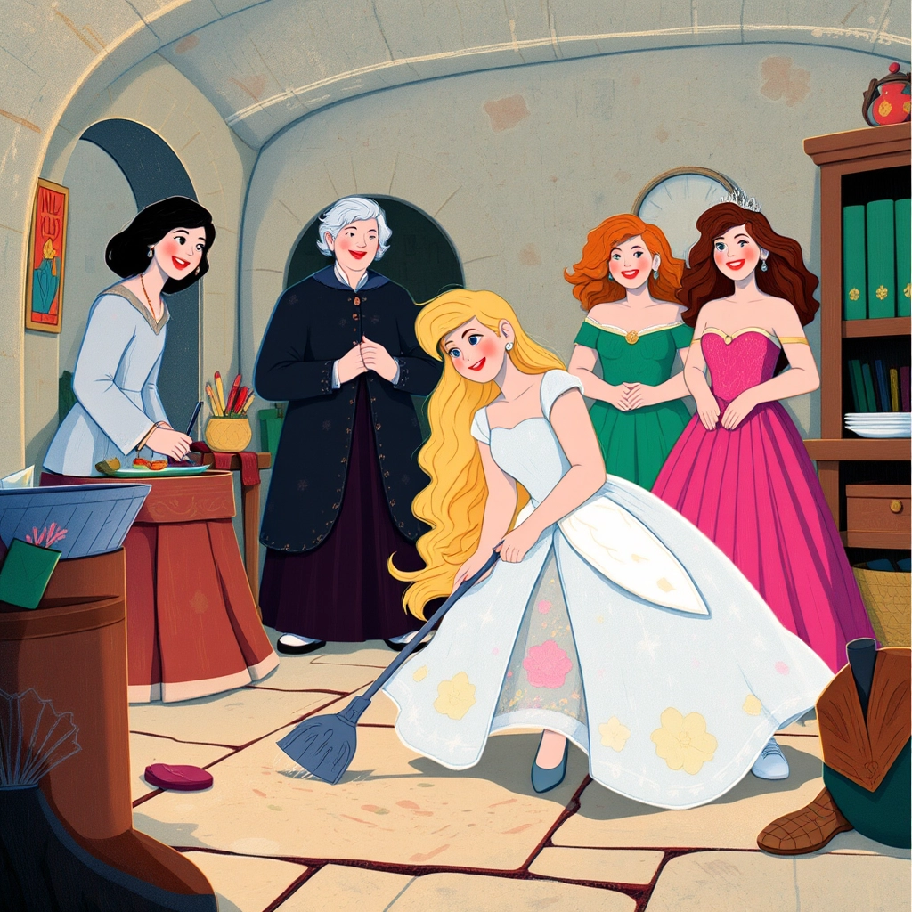 [Cinderella](PHQ4XWY4)’s stepmother and stepsisters were jealous of her beauty and forced her to do all the housework, while they dressed in finery and went to parties.