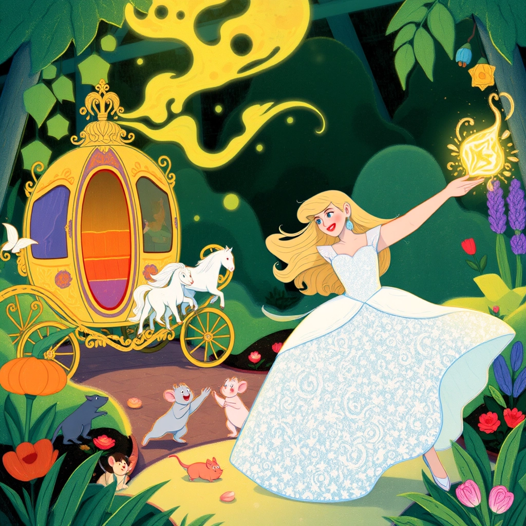 With a wave of her wand, the [Fairy Godmother](ZDR9BYGQ) transformed a pumpkin into a carriage, mice into horses, and [Cinderella](PHQ4XWY4)’s rags into a dazzling gown.