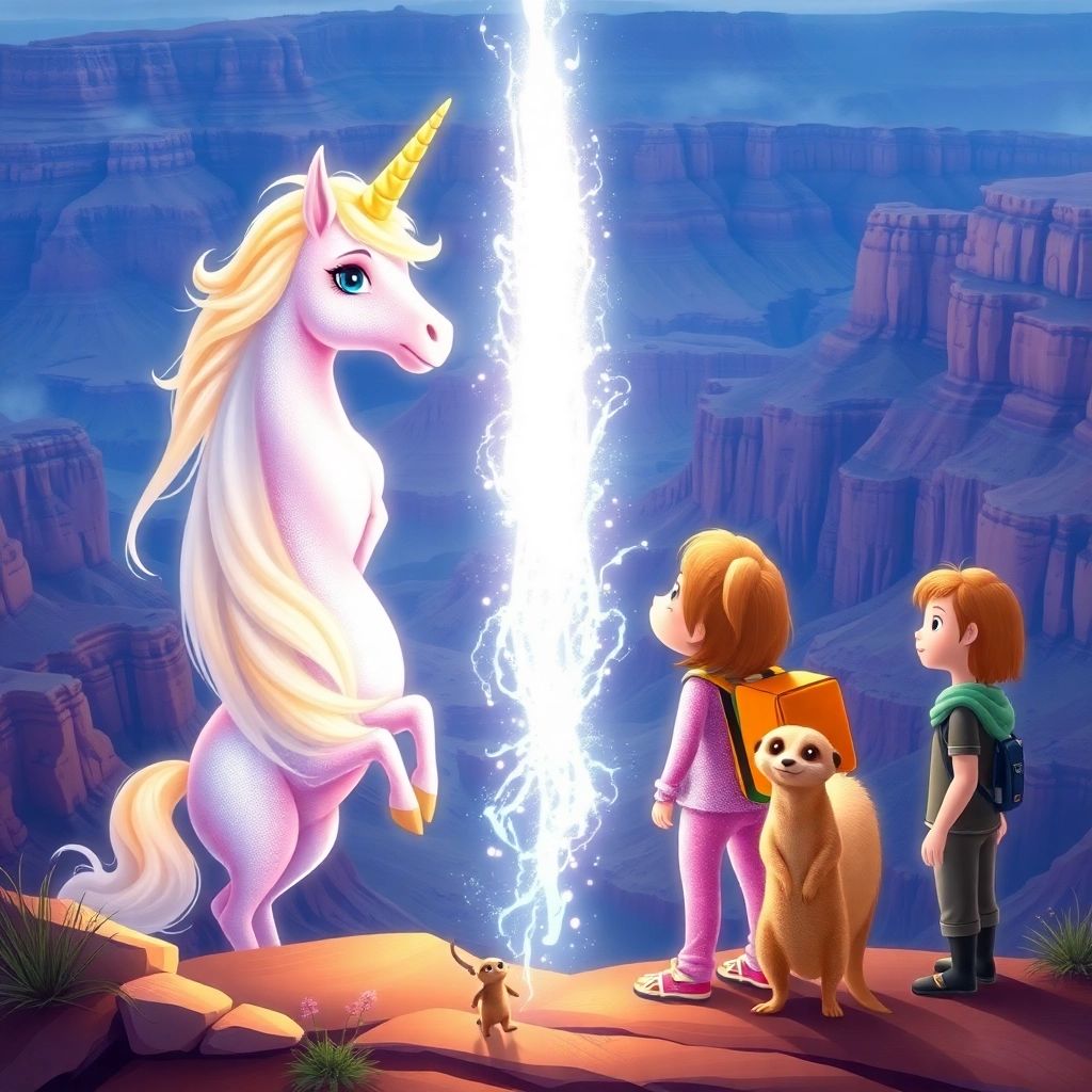 In der Höhle entdeckten sie alte Wandmalereien, die die Geschichte eines alten Einhorn-Wächters erzählten. Der Wächter bewachte den Grand Canyon und gab jedem mutigen Reisenden eine wertvolle Lektion.