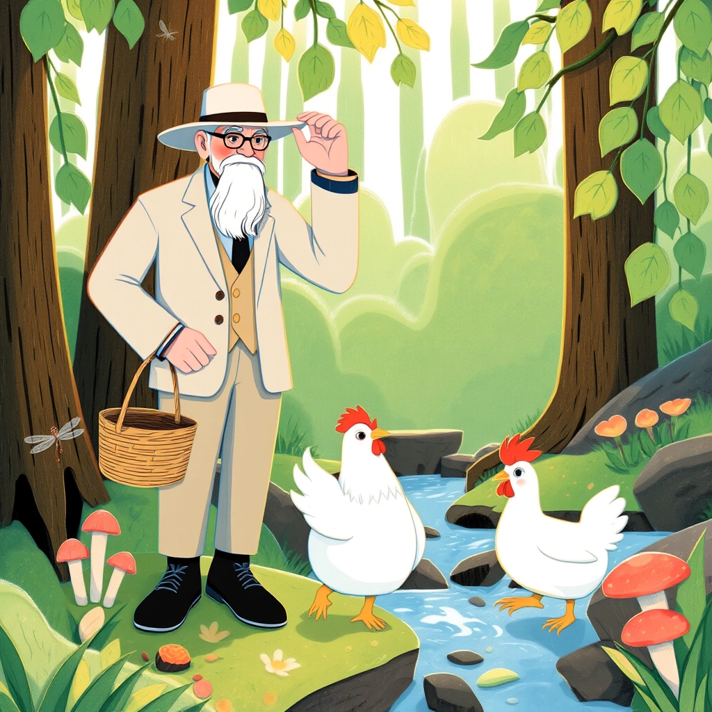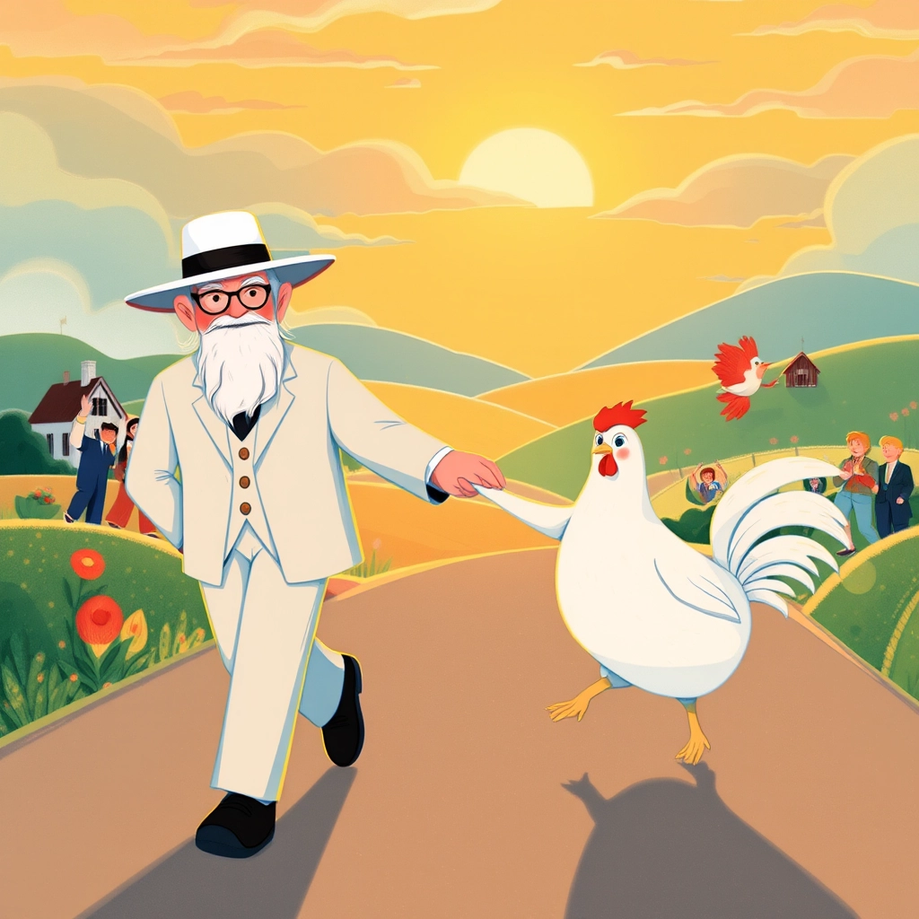 [Colonel Harwad](DP3KHXZ7) was known far and wide for his friendly smile, kind heart, and his love of cooking. Especially chicken! One sunny morning, he set out on a walk with his loyal white hen, [Clucky](7XNHWPK6), to find the freshest ingredients for his next recipe.