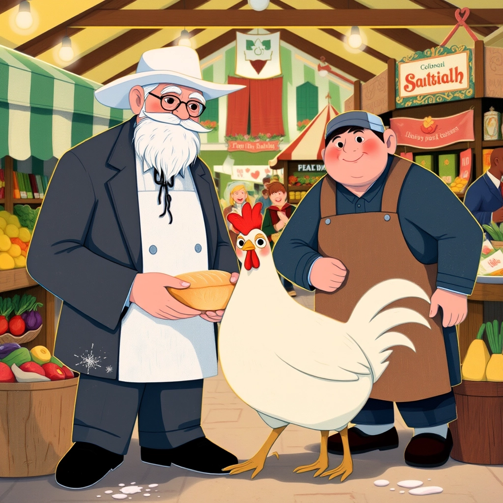 Finally, they reached the market's spice stall, where aromas of paprika, garlic powder, and pepper filled the air. The Colonel carefully selected a handful of spices, determined to make his meal a masterpiece.