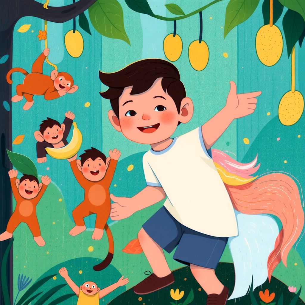 Next, they floated down to a jungle full of friendly animals. [Cosmo](ZZPP3KDT) and [Sparkle](HVCY2954) giggled as monkeys swung by, offering juicy fruits.