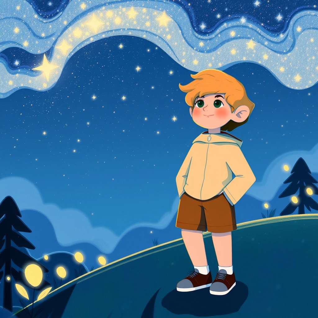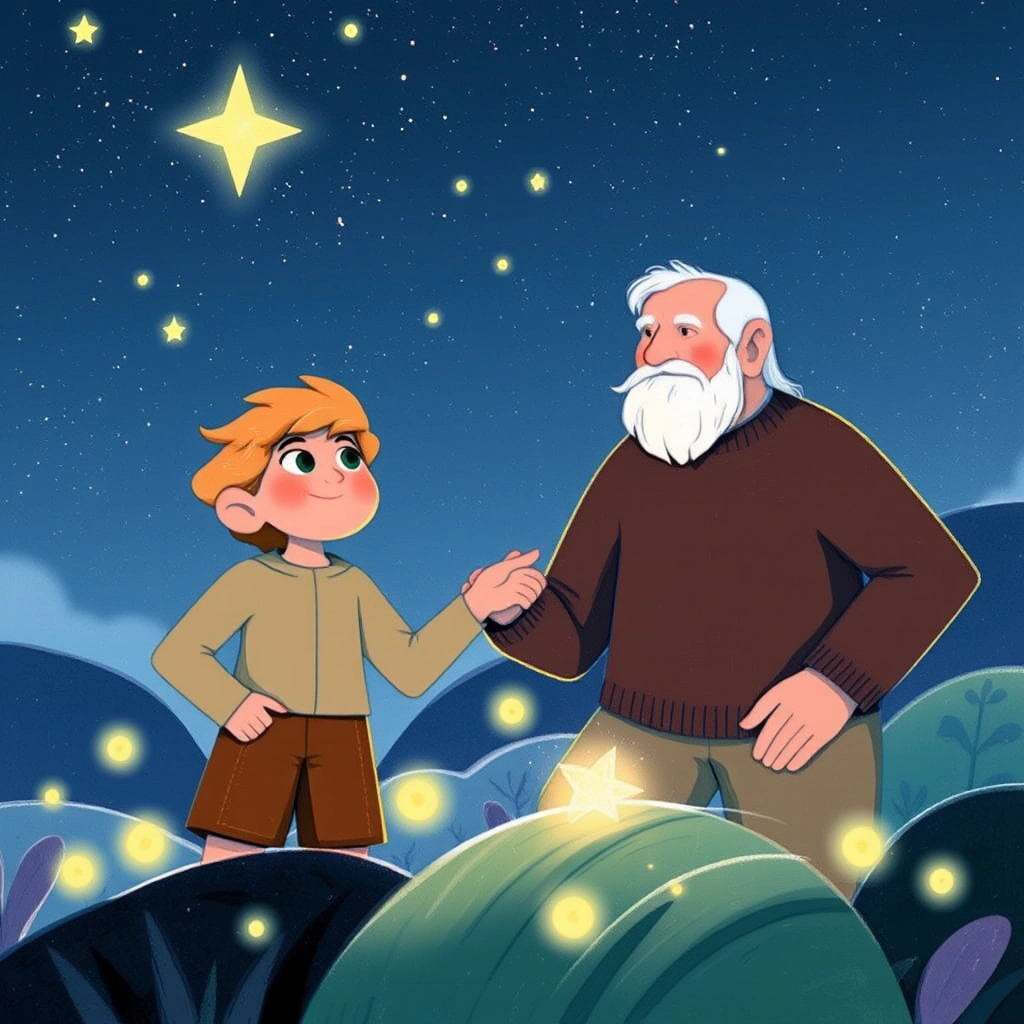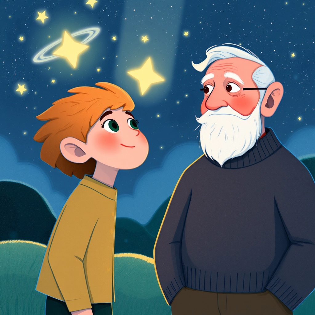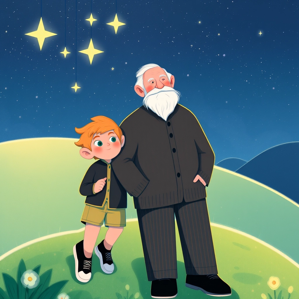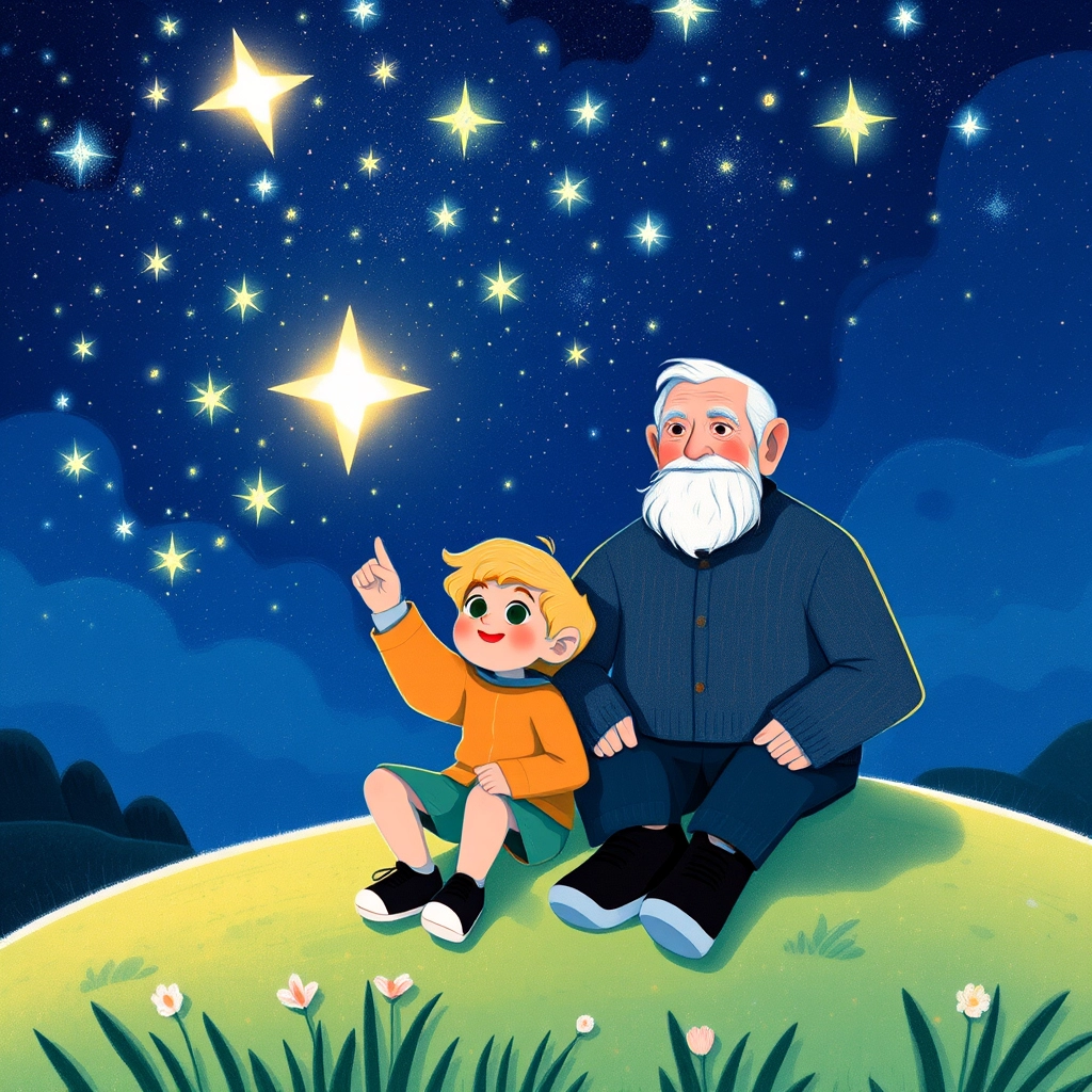 One peaceful evening, [Nat](LL7HK4MY) and his [Abuelo](TF3LVBW7) sat on their favorite grassy hill. The sky above was as dark as velvet, dotted with sparkling stars. "Look at all the stars, [Abuelo](TF3LVBW7)!" exclaimed [Nat](LL7HK4MY). "There are so many!"