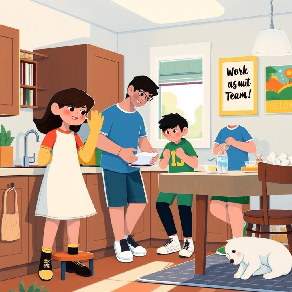 After breakfast, it was time to clean up. 'Everyone has a job!' said [Coach Mike](QX9H6KXH). [Leo](9GDQBMV2) was in charge of setting the table, and [Bella](ZQKF5SD3) washed the dishes. 'Teamwork makes the dream work!' they all cheered.