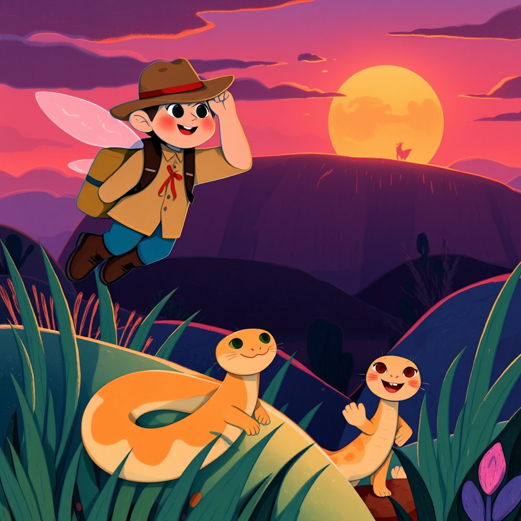 [Dagz](Y7KZBCWD) spotted the legendary Uluru! It shimmered like a great orange giant under the setting sun. He buzzed closer but heard [Daisy](BHZ9K3KD)'s warning: 'Watch the ground—they say sneaky snakes live around here!'