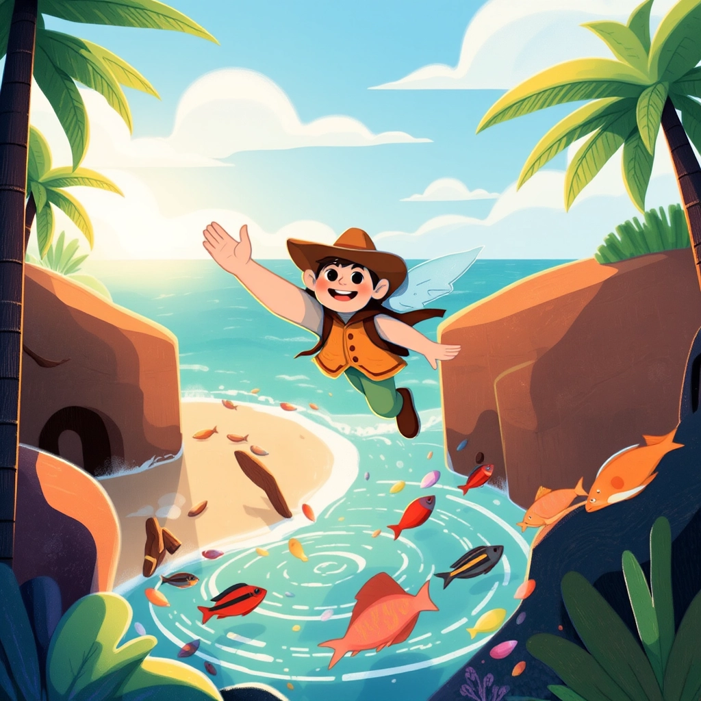 By sunrise, [Dagz](Y7KZBCWD) had reached the Great Barrier Reef. Though far from home, he practiced flying low to greet curious fish leaping out of shimmering blue waters.