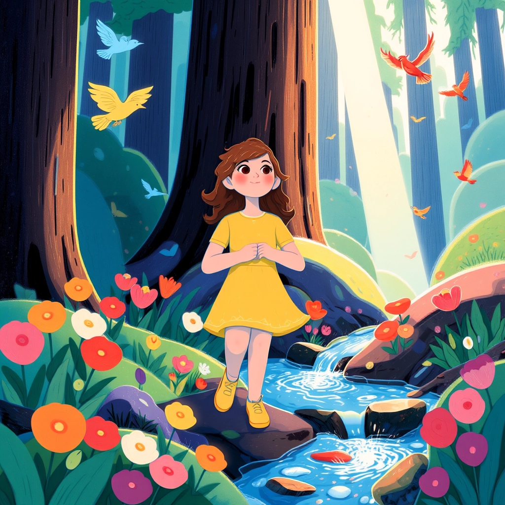 Curious about the squirrel, [Daisy](LX5DFLL9) decided to follow it. She carefully walked into the woods behind the school, where she found a magical place filled with blooming flowers, chirping birds, and sparkling streams.