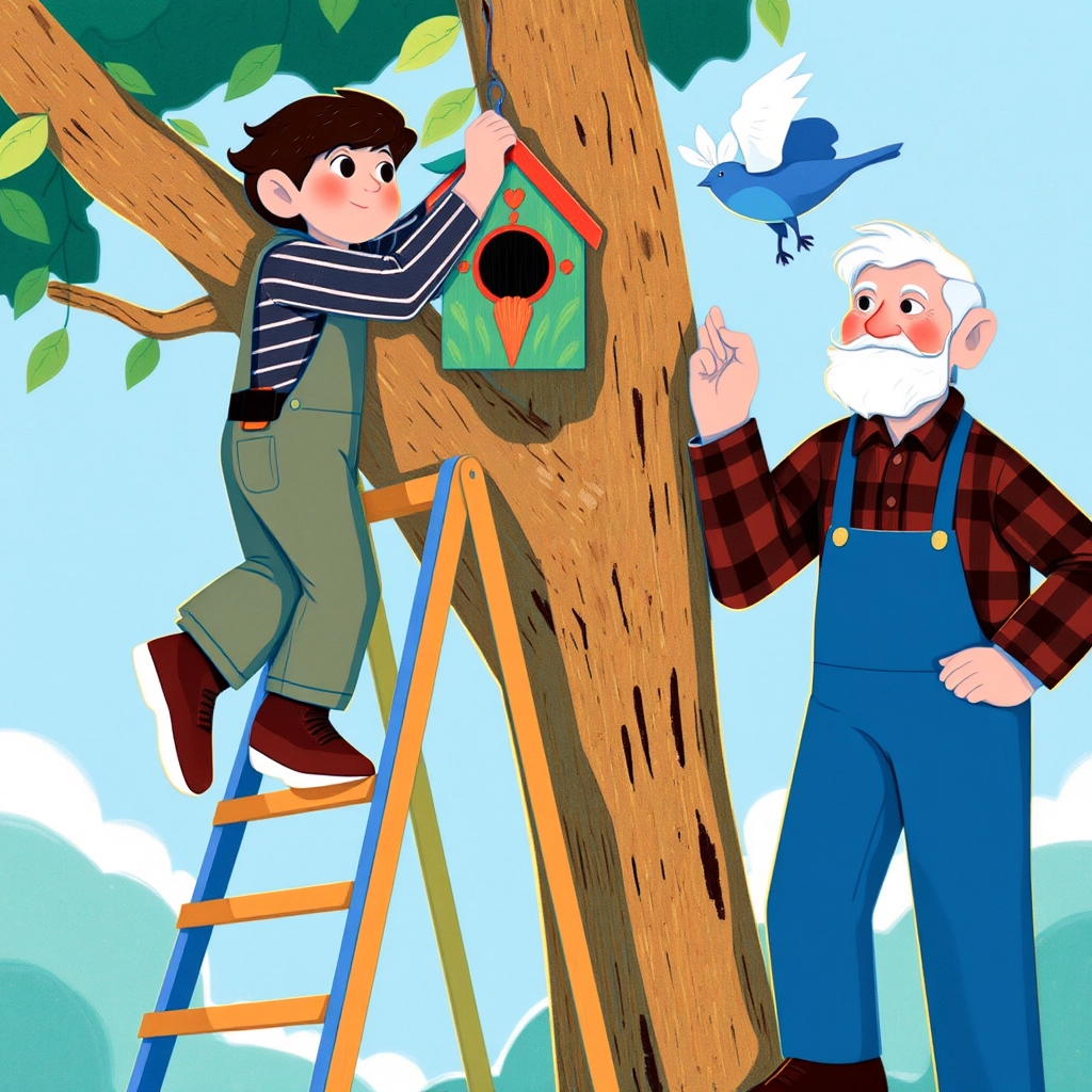 With [Dadda](5YGZYJY6)’s help, [Damon](QKVDTBMJ) hung the birdhouse back on the tree. "There you go, little friend," [Damon](QKVDTBMJ) said. The bluebird flitted inside the new house right away!