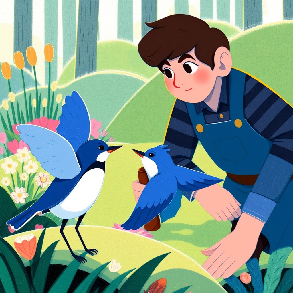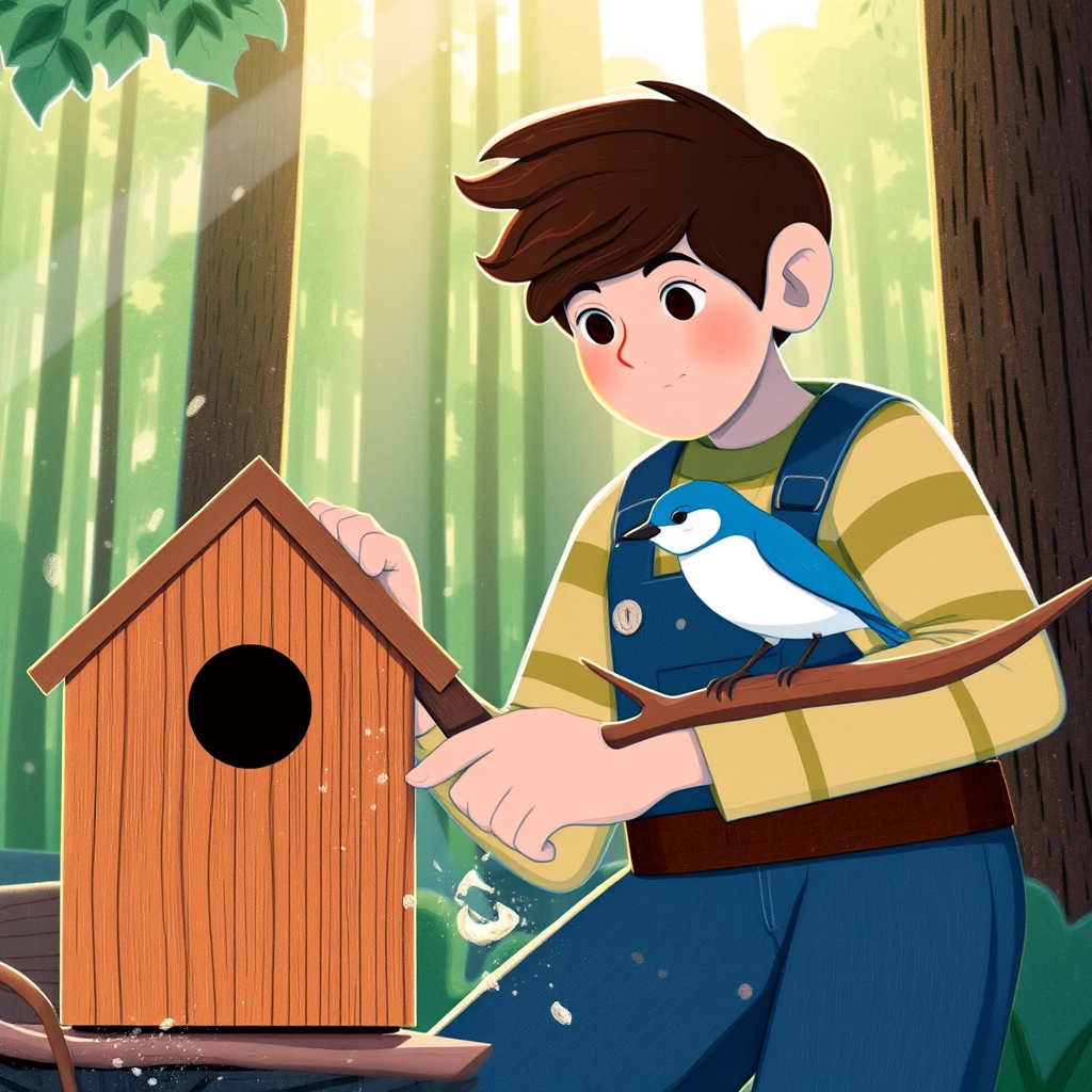 One breezy morning, while [Damon](QKVDTBMJ) was working on a birdhouse, he noticed a tiny bluebird hopping nervously nearby. The bird chirped loudly, looking quite upset!