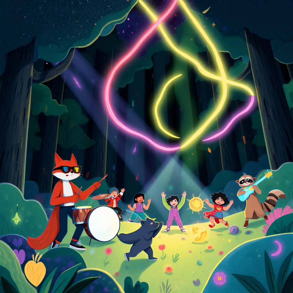 When they reached the clearing, they saw the most amazing sight: colorful lights spinning in the air, children dancing joyously, and music played by a band made up of friendly animals, including a fox on the drums and a raccoon with a guitar.