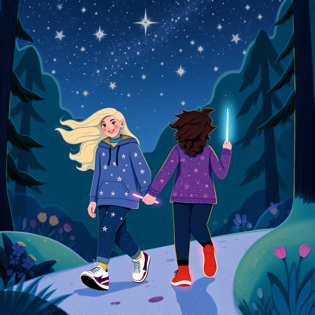 Under the twinkling stars, the girls walked home together, talking about their favorite moments. They couldn’t wait for their next adventure in the enchanted forest.