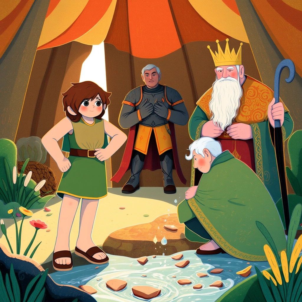 [David](MC544RLT) went to [King Saul](W65HC7TG) and declared, 'I can defeat him! I’ve fought off bears and lions while protecting my sheep!' [King Saul](W65HC7TG) was surprised but decided to let [David](MC544RLT) try. He offered [David](MC544RLT) his armor, but it was too heavy and big for him. Facing the challenge, [David](MC544RLT) chose five smooth stones from a stream and held his trusty slingshot.
