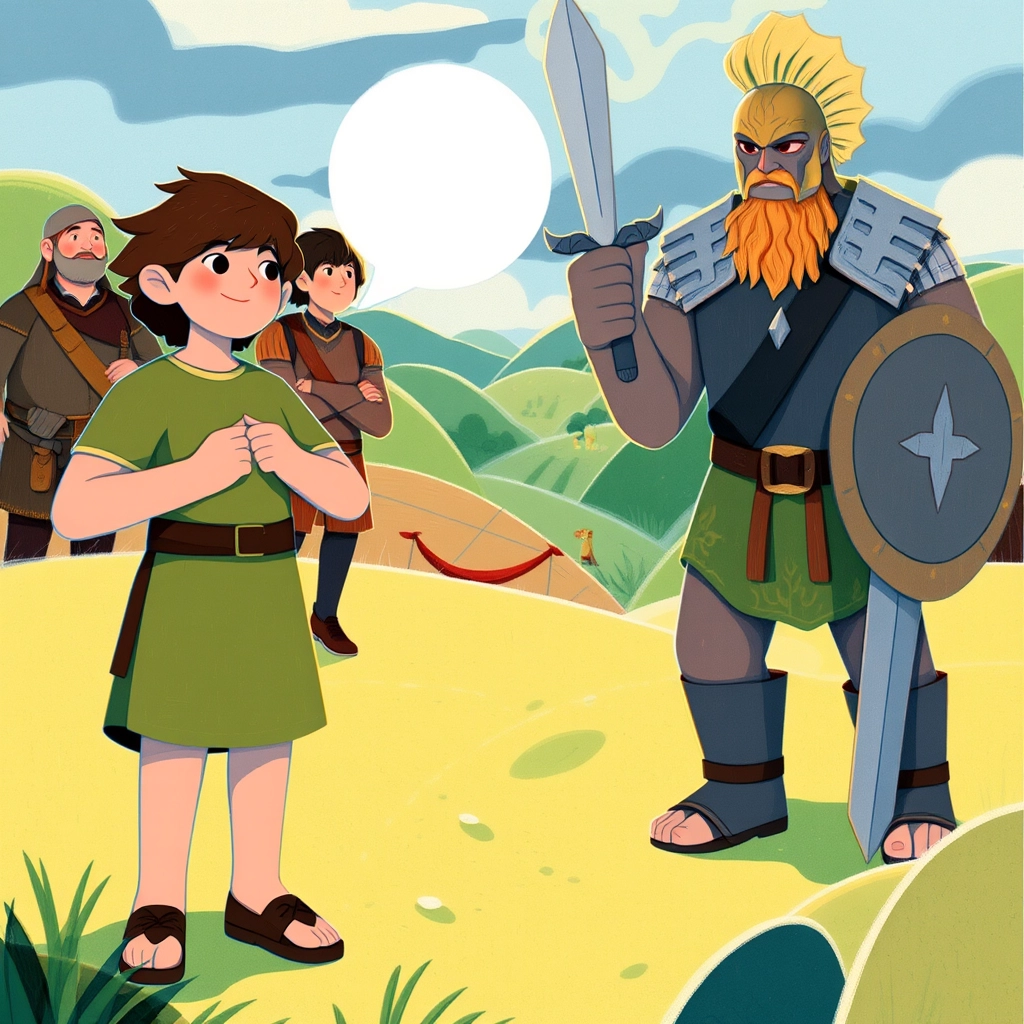 One day, a big problem arose for the Israelites. They were at war with the Philistines, who had a gigantic warrior named [Goliath](ZPKV3PYG). [Goliath](ZPKV3PYG) was taller than any tree, had muscles like iron, and roared like a lion! Every day, he would step forward and challenge the Israelites, saying, 'Choose a champion to fight me! If he wins, we will serve you. But if I win, you will serve us!'