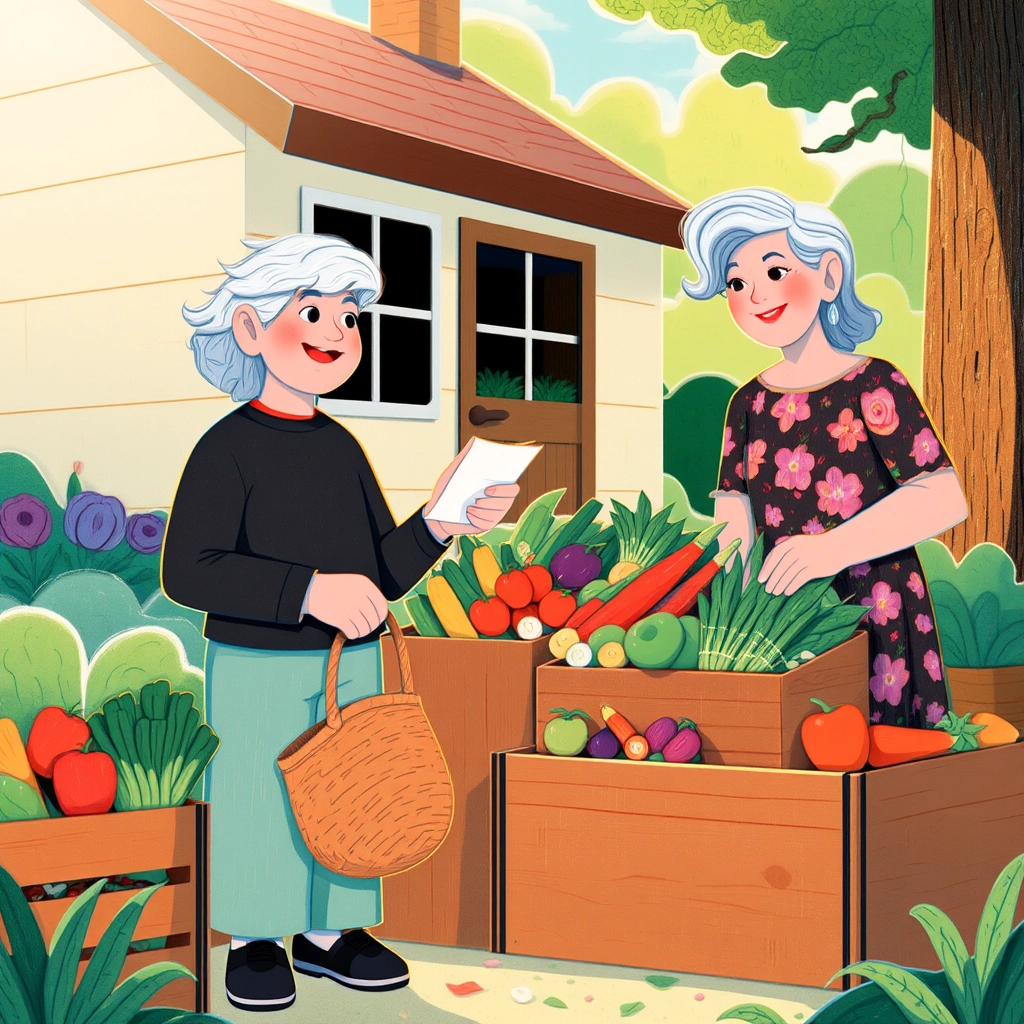 As [David](BHXT555K) walked closer to the third house, he saw the vegetable lady. She had a friendly smile and a market stand filled with fresh, colorful vegetables. There were bright green cucumbers, red tomatoes, orange carrots, and shiny purple eggplants. [David](BHXT555K) introduced himself and politely gave her his mother’s shopping list.
