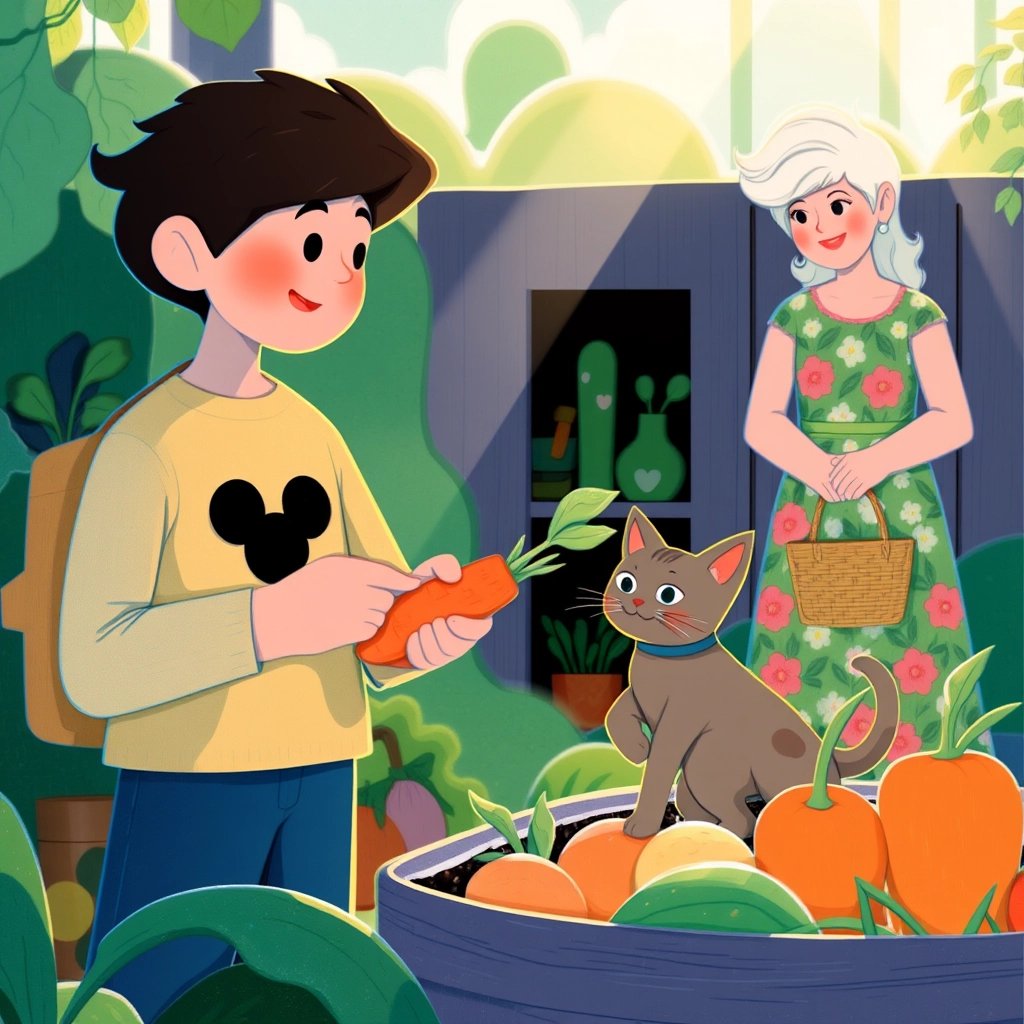 The vegetable lady carefully selected items from her stand. 'Here are the freshest cucumbers and tomatoes!' she said with a cheerful laugh as she placed them in [David](BHXT555K)'s basket. [David](BHXT555K) watched carefully, learning about the vegetables. 'These are carrots,' she explained, 'and they are full of vitamins to help you grow big and strong!'