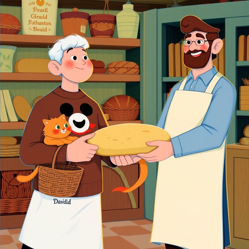 [David](BHXT555K) carried the kitten toward the bakery, and the baker was thrilled to see Sugar. 'Thank you, young man!' said the baker, handing [David](BHXT555K) a warm loaf of bread as a thank-you gift. Sugar meowed happily and purred in [David](BHXT555K)’s arms before running back inside.