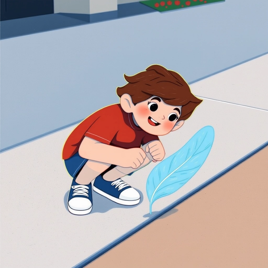 Suddenly, [David](7P3GKFC6) noticed a blue feather lying right in the middle of the sidewalk. His eyes grew wide with curiosity, and he bent down to pick it up.